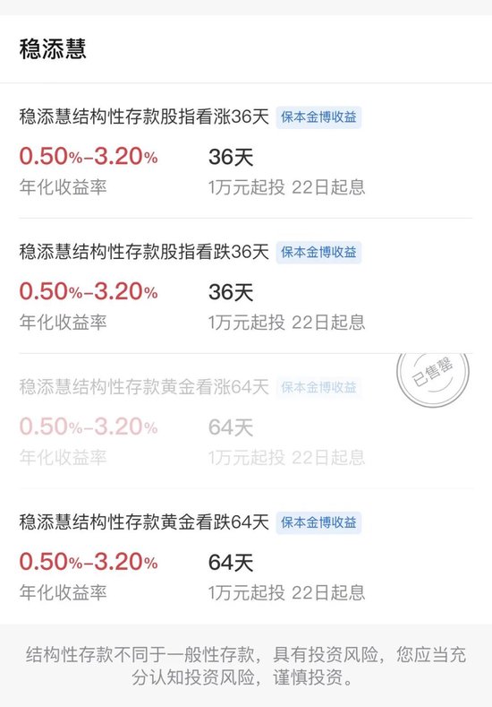 交通银行手机App显示,该行稳添慧结构性存款产品共有四款,分别为黄金看涨64天、黄金看跌64天、股指看涨36天和股指看跌36天邦乾配倍,年化收益率区间均为0.5%—3.20%。四款产品募集期均为1月14日至20日,1月16日下午2时左右中新经纬查看时,黄金看涨64天结构性存款产品“已售罄”,其余产品均有额度。